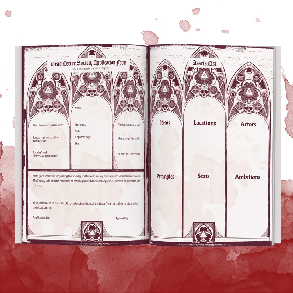 With over 100 pages of full colour content and custom illustrations, Dead Letter Society is a beautiful game. A free preview is coming on January 30th and even if the game itself doesn’t hit your interest boxes, it really is worth checking out just for how pretty it is. The character sheets (Dead Letter Society Application Form, shown below) alone are a thing of absolute art, making me immediately think of triptychs and stained-glass windows – I love the macabre elements and the darker red used for their design. Makes me wish my penmanship with my fountain pen was better!