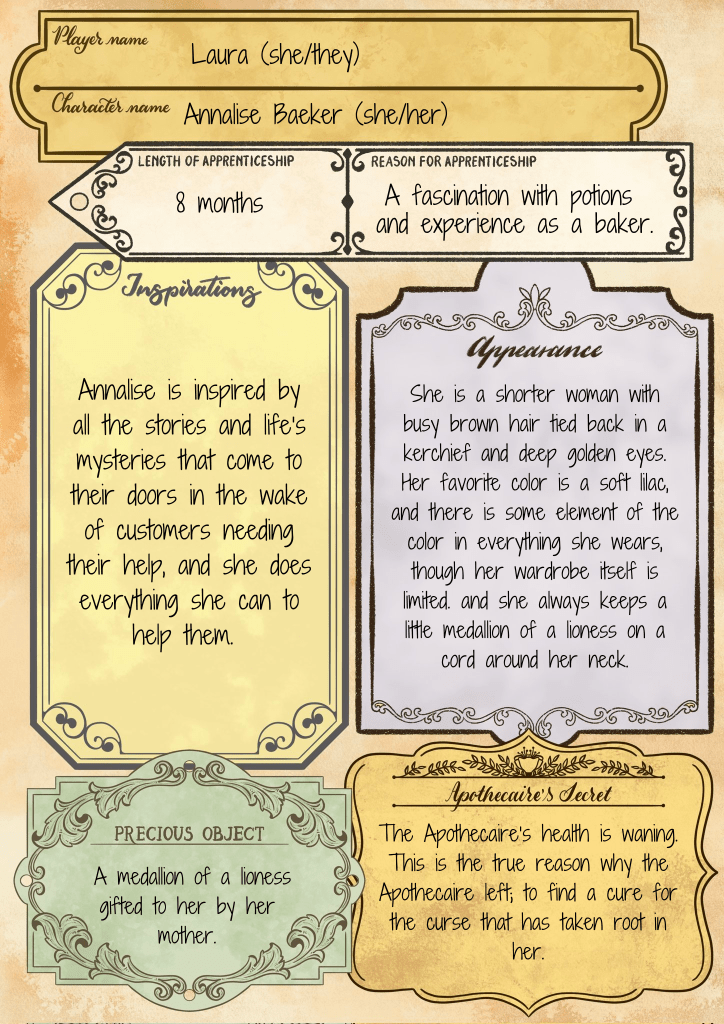 One fateful day, the Aopthecaire leaves her little cottage on a week-long journey, telling her apprentice to take care of any customers who stop by for potions. THere are lists of ingredients and recipes for the most standard of potions if they are out of stock, but not all customers want something easy. Part of your apprenticeship is to log the customers’ details in a big, dusty tome the Apothecaire keeps as a record ofher time and ingredients, as well as descriptions of the customers themselves, as their energy and mood also affect the magical working…