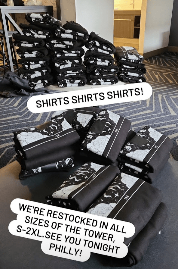 Driving in Philly is an experience I’m glad to be a passenger for, as the one-way streets add a solid extra ten minutes to our drive. Getting into the venue happens down a set of narrow steps – it’s in a church basement which is neat – and I am watching my steps very, very carefully on my way down. My Tower prepping the night before pays off and we’re fully restocked in all sizes for that design, while Sanitizer stores are now fully out of backups – what’s in the rolling bin is what we’ve got.